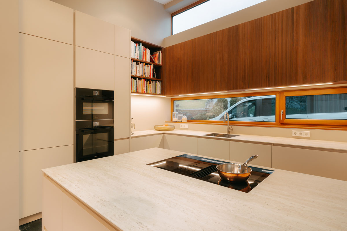 Architektenküche mit Travertin Keramik und Nussbaukontrast